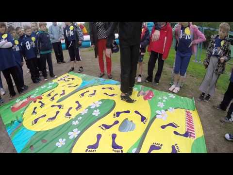 Цель игры: пройти по тропинке от начала до финиша, вступая след в след, при командной игре, можно добавить прохождение на время. Разворачивать ноги как на рисунке, получается очень задорно и весело.