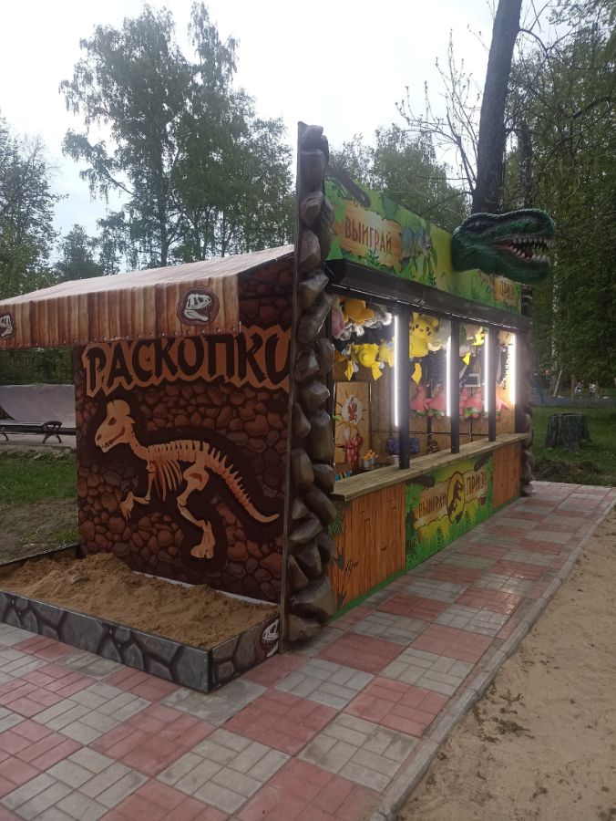 3) с другого бока будет размещаться "раскопки динозавра" - песочница для самых маленьких, где надо будет отыскивать спрятанные части скелета. Если фотозона по задумке будет бесплатной, то здесь уже можно работать по тарифу.Песочница будет распологаться под козырьком.
